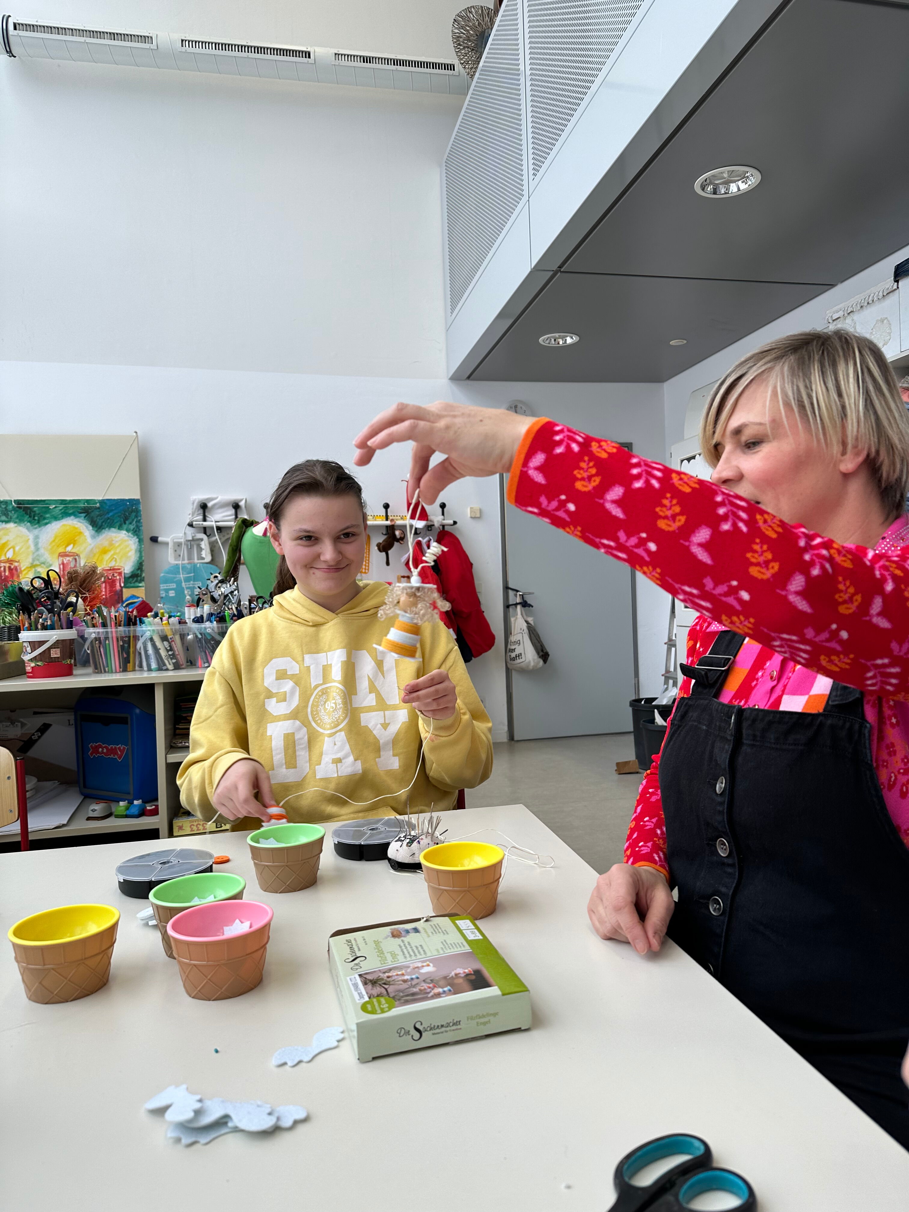 Für die jüngeren Klassen bietet sie vielfältige Möglichkeiten an, sich kreativ auszudrücken: Seifen und Kerzen herstellen, Bilder kleben, Taschen und Kissen nähen, T-Shirts bedrucken und vieles mehr. Bei unserem Besuch basteln die Kinder gerade Weihnachtsengel für den Adventsbasar. Die meisten Schüler*innen sind regulär einmal die Woche im Näh- bzw. Kreativunterricht. Spätestens zu den Märchenprojektwochen im Februar haben dann wirklich alle Schüler*innen die Möglichkeit, in die Werkstatt zu kommen. „Wir machen hier eigentlich alles, was Spaß macht. Auch mal Malen nach Musik.