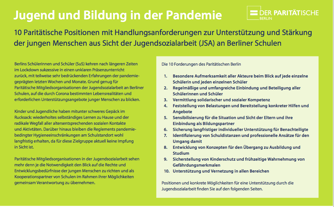 Der Deutsche Paritätische Wohlfahrtsverband Landesverband Berlin e. V. hat gemeinsam mit Berliner Trägern – darunter auch die tandem BTL gGmbH – ein Positionspapier zu Jugend und Bildung in der Pandemie erarbeitet. Das Positionspapier beleuchtet die Lage junger Menschen im Bildungsgeschehen aus Sicht der Jugendsozialarbeit und gibt paritätische Handlungsanforderungen und Beispiele, was Sozialarbeit an Schule an Unterstützung leisten kann.