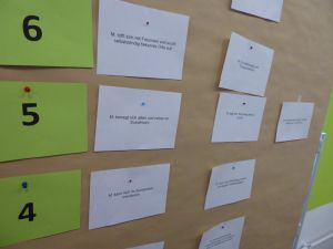 Ein zweites Ziel war es, Abteilungsleitungen und Mitarbeiter*innen, die bereits auf verschiedene Weise im Kontext der Wirkungsorientierung erste Erfahrungen gesammelt hatten, in die Lage zu versetzen, ihr Wissen zu multiplizieren und anderen bei deren Fragen zu beraten. Konkret haben sie in der Rolle der Gruppenmoderation in der Vorbereitung Fallbeispiele und Praxissituationen erarbeitet und diese im Gesamtteam in Gruppenarbeiten erläutert.